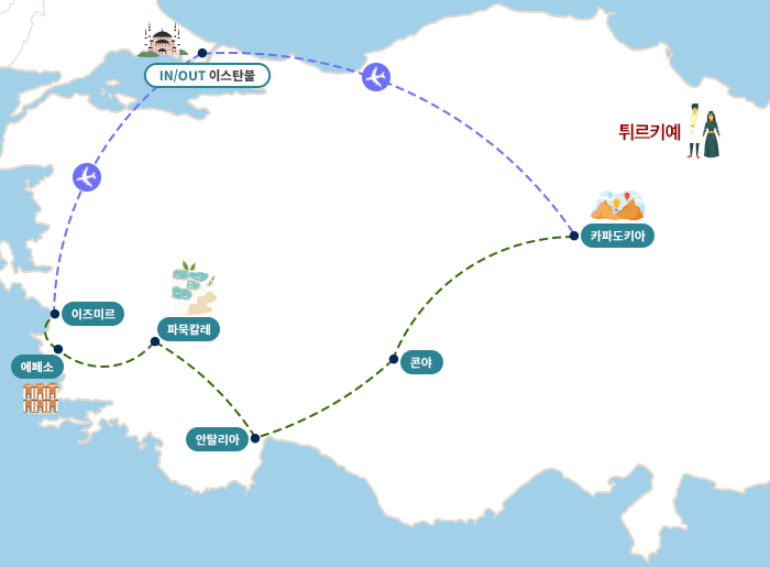 인천-이스탄불(1)-[항공]-카파도키아(1)-콘야(1)-안탈리야(1)-파묵칼레(1)-에페소-이즈미르-[항공]-이스탄불(2)-기내(1)-인천