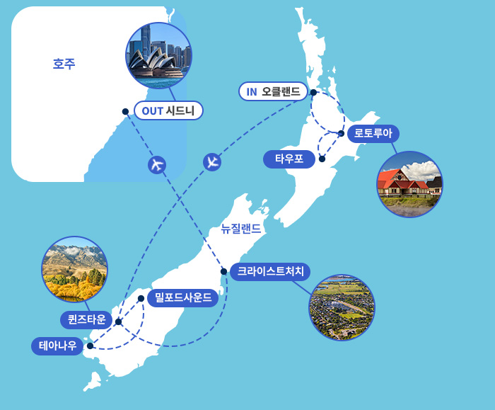 ■ 항공 - 국제선: 대한항공 인천 <-> ☆오클랜드/시드니 왕복 비즈니스석 직항편 이용☆ - 국내선: 호주, 뉴질랜드 내 국내선 2회 이동으로 차량 이동 최소화로 여유로움 PLUS 편안함 UP * 에어뉴질랜드, 콴타스, 젯스타 등 현지 항공사 이용 * 현지 항공 예약 상황에 따라 항공편 및 탑승시간이 변경될 수 있습니다. * 현지구간 항공사에 따라 기내 서비스가 유료로 진행될 수 있습니다.