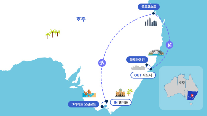 ■ 항공 - 아시아나 시드니/멜버른 직항편 이용 (시드니 IN - 멜버른 OUT)- 호주 내 국내선 1회 이동으로 차량 이동 최소화로 편안함 UP * 콴타스, 젯스타, 버진아일랜드 등 항공사 이용■ 호텔 - 한진관광이 엄선한 4성급(★★★★) 호텔 이용