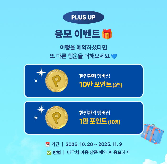 - 경품인 한진관광 포인트는 12월 내 적립될 예정이며, 포인트 경품에 대한 유효기간은 1년입니다.